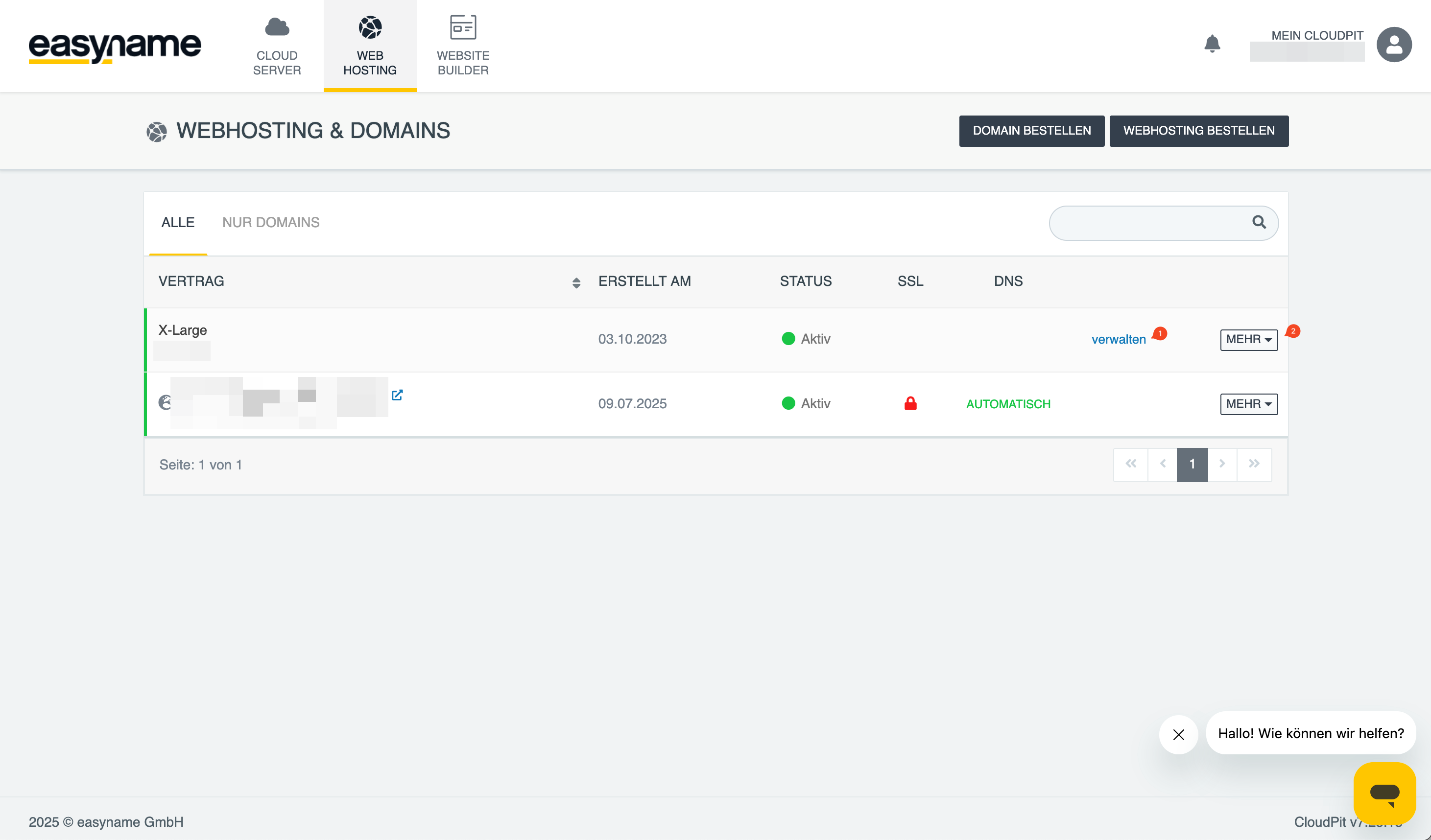 Im Kundenkonto wählen Sie das gewünschte Webhosting-Paket und klicken auf [Verwalten] (1) oder über [MEHR ⏷] (2) → [Verwaltung öffnen].