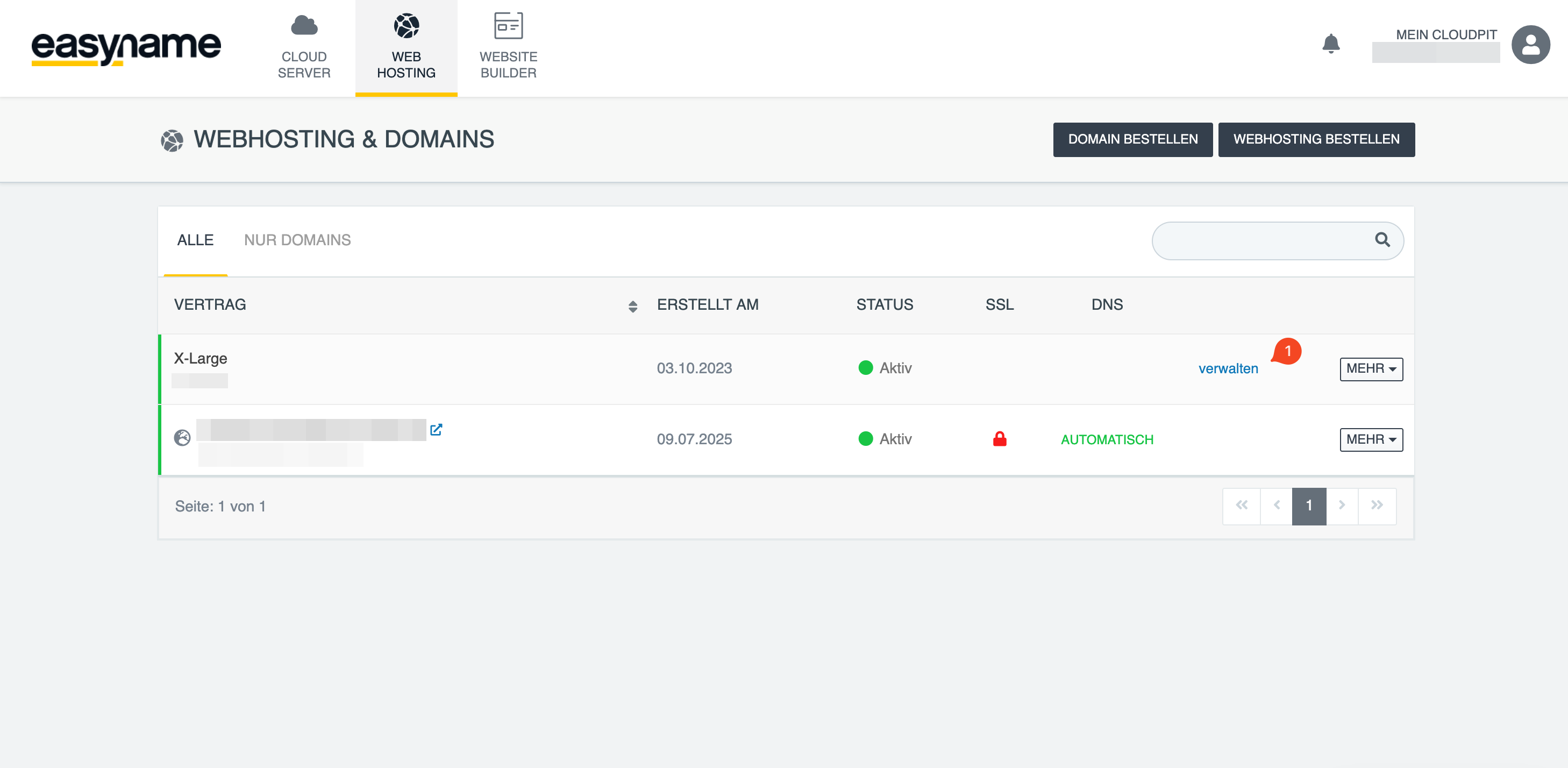 Neben dem gewünschten Hosting auf verwalten (1) klicken (alternativ über [MEHR ⏷] → [Verwaltung öffnen]).