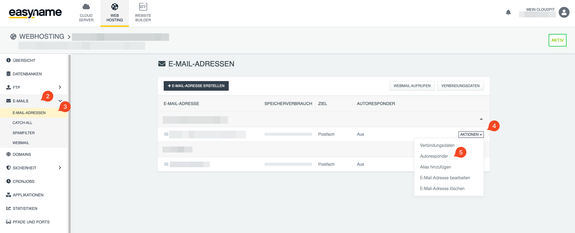 In der Übersicht die gewünschte E-Mail-Adresse suchen und bei dieser auf [AKTIONEN ⏷] (4) → [Autoresponder] (5) klicken.