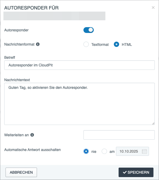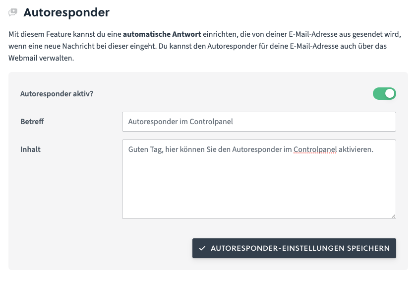 Der Autoresponder ist nach dem Speichern aktiv und kann jederzeit über die gleichen Menüpunkte wieder deaktiviert werden.
