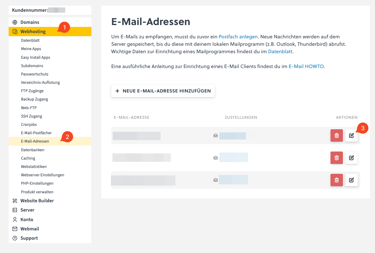 In der Übersicht bei der gewünschten E-Mail-Adresse auf das Notizblock-Symbol ([E-Mail-Adresse bearbeiten]) (3) klicken.