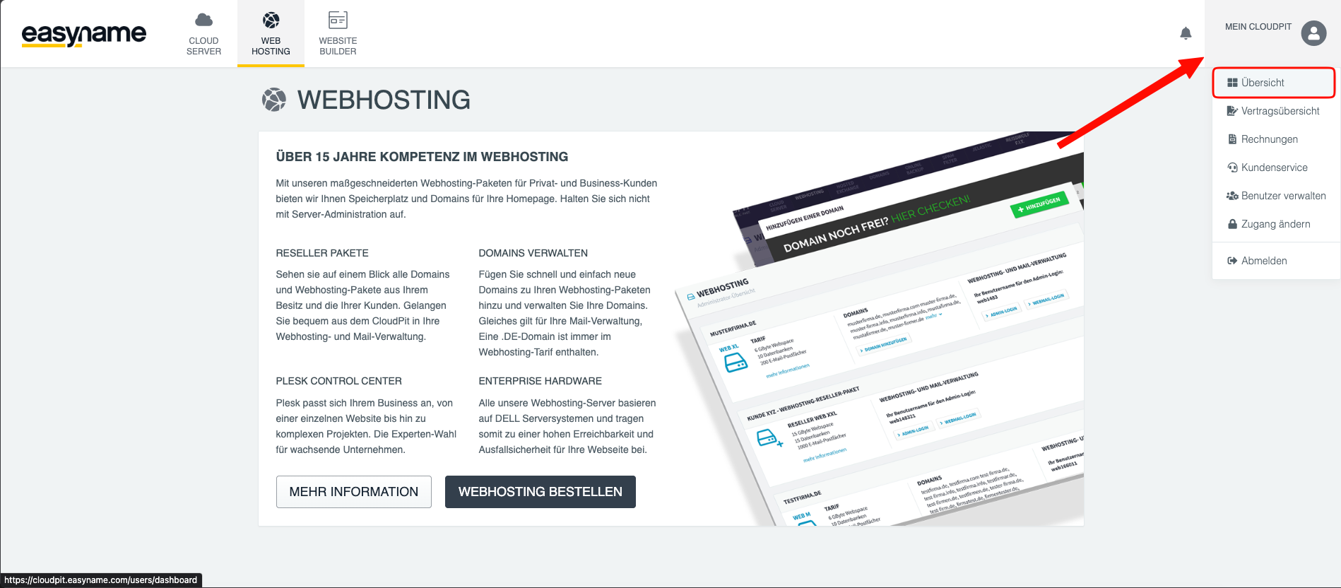- Loggen Sie sich in Cloudpit ein und Navgieren zum Menü in der rechten oberen Ecke und Wählen "Übersicht" aus.