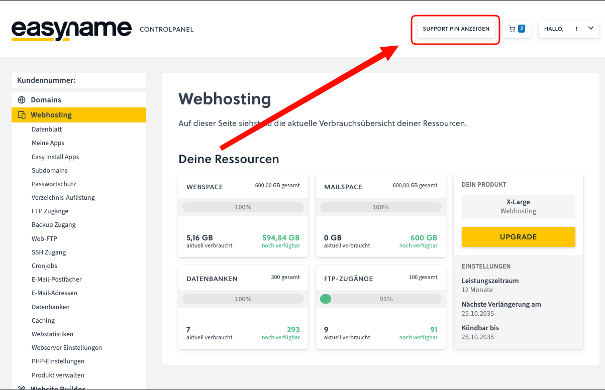 - Nach dem Login in das Controlpanel, klicken Sie am oberen Rand des Bildschirm auf die Schaltfläche "Support PIN anzeigen"