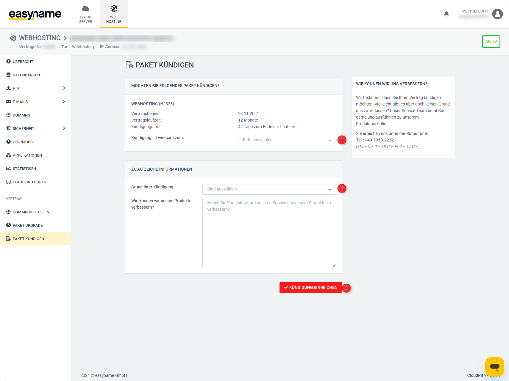 Im nächsten Menü finden Sie noch einmal alle Relevanten Laufzeitdaten zum Webhostingpaket wie Vertragsbeginn, Vertragslaufzeit und die Kündigungsfrist. Unter "Kündigung ist wirksam zum" (1) müssen Sie aus der Dropdownliste das gewünschte Kündigungsdatum auswählen. Die angegebenen Daten sind immer im Bezug auf die Kündigungsfrist. Danach müssen Sie noch einen Kündigungsgrund (2) auswählen und können noch unter "Wie können wir unsere Produkte verbessern" Feedback geben. Dieser Punkt ist optional. Nun können Sie über den Button "Kündigung einreichen) (1) die Kündigung finalisieren.