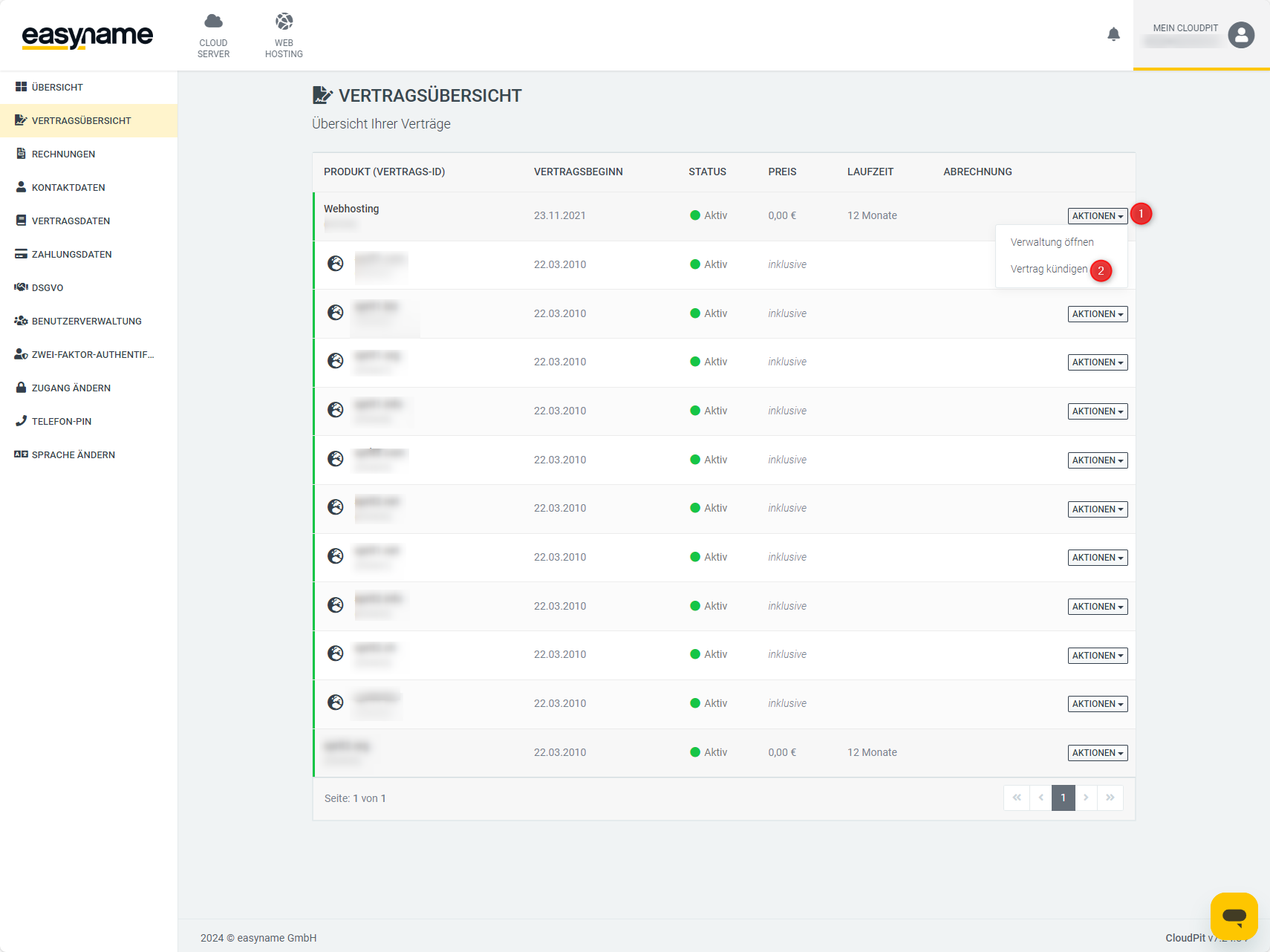 In der Vertragsübersicht klicken Sie dann bei dem zu kündigenden Hostingpaket auf "Aktionen"(1) und dann auf "Vertrag kündigen"(2)