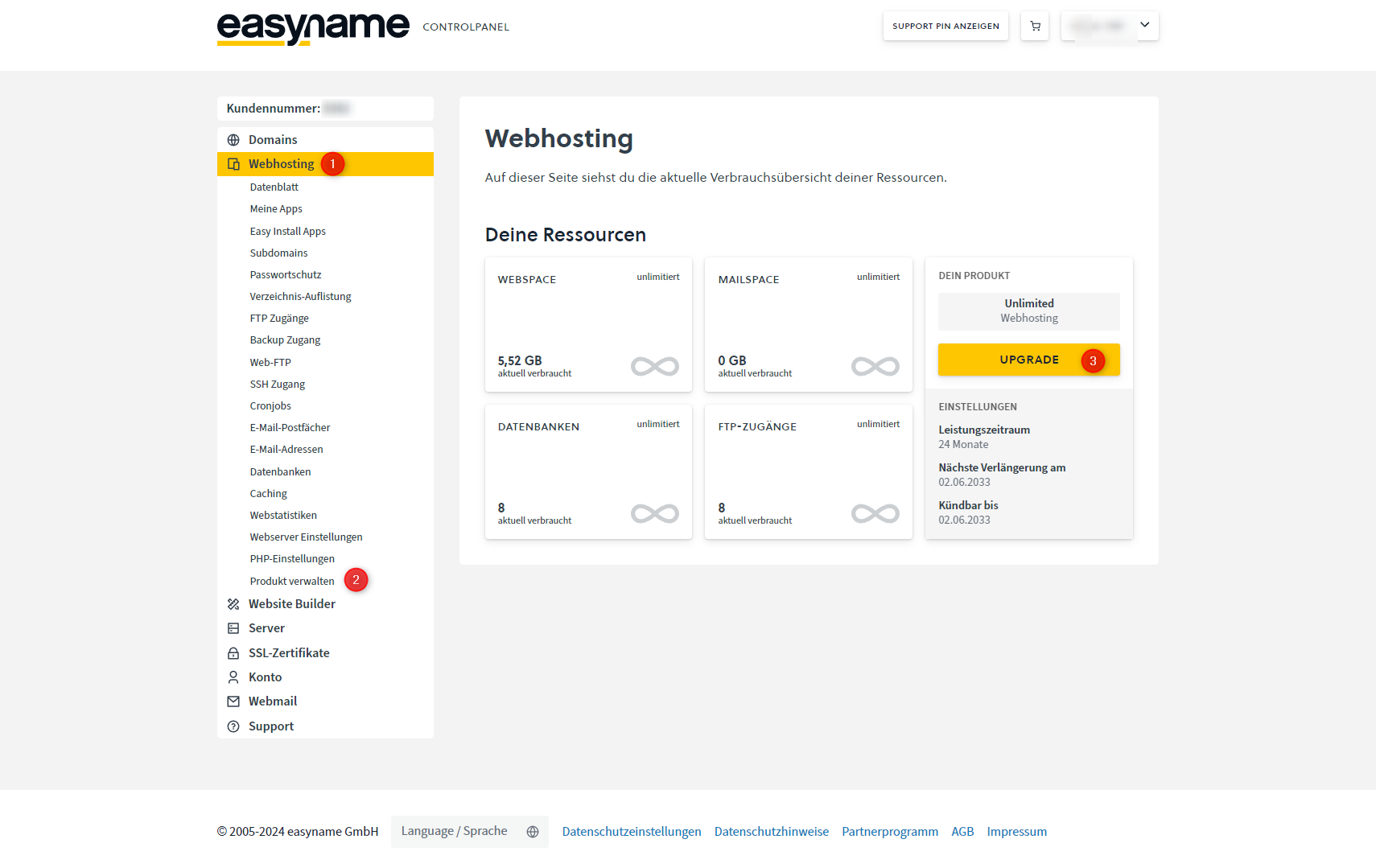 Zuerst loggen Sie sich in Ihren Controlpanel über unsere Website ein Anmelden | easyname. Nachdem Sie sich eingelogged haben klicken Sie links auf den Reiter "Webhosting"(1). Danach klicken Sie auf den Untermenüpunkt "Produkt verwalten"(2)