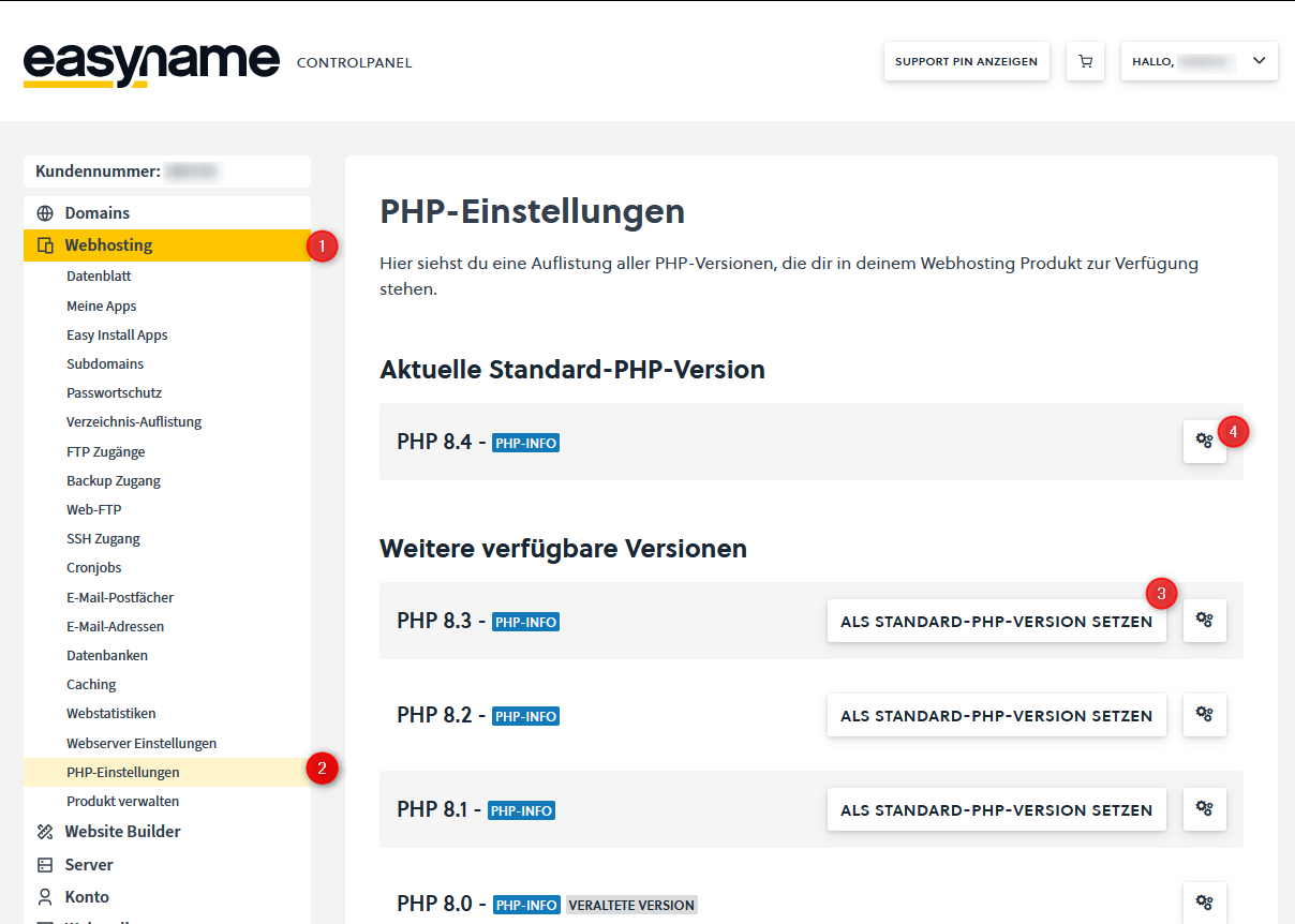 Sie können die Standard-PHP-Version anpassen, indem Sie im Controlpanel zunächst im Menüpunkt [Webhosting] (1) auf den Unterpunkt [PHP-Einstellungen] (2) klicken. Die aktuell eingestellte Standardversion wird oben angezeigt, gefolgt von einer Liste der verfügbaren Versionen. Klicken Sie neben der gewünschten Version auf [Als Standard setzen] (3), um die Einstellung zu ändern. Unter dem Link [Einstellungen] (4) neben der jeweiligen Version können Sie weitere Parameter anpassen, wie z.B. den PHP session_cache von memcached, filesystem oder redis.