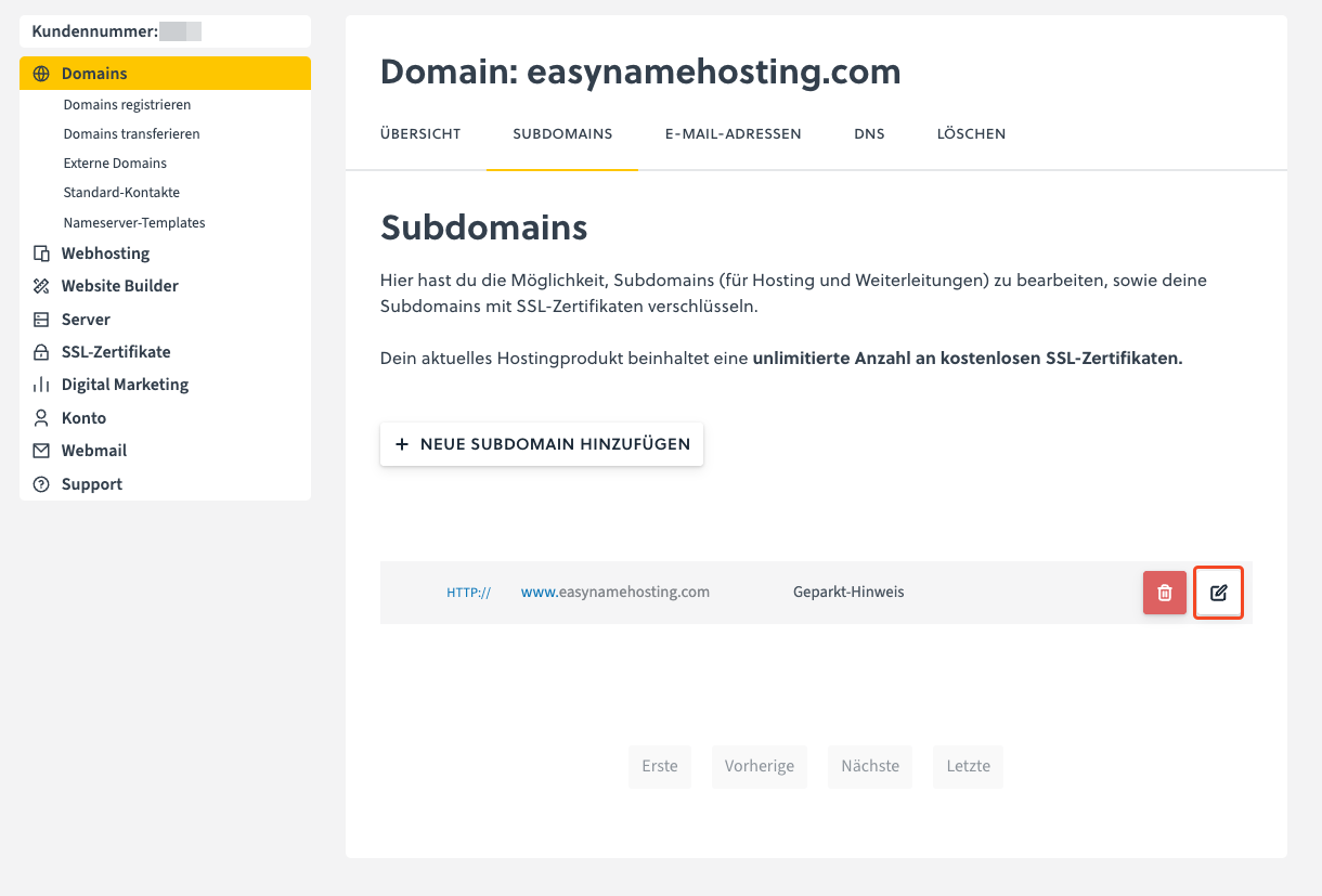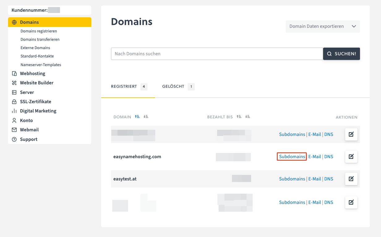 Klicken Sie auf [Domains] → bei der neuen Domain (hier easynamehosting.com) auf [Subdomains]
