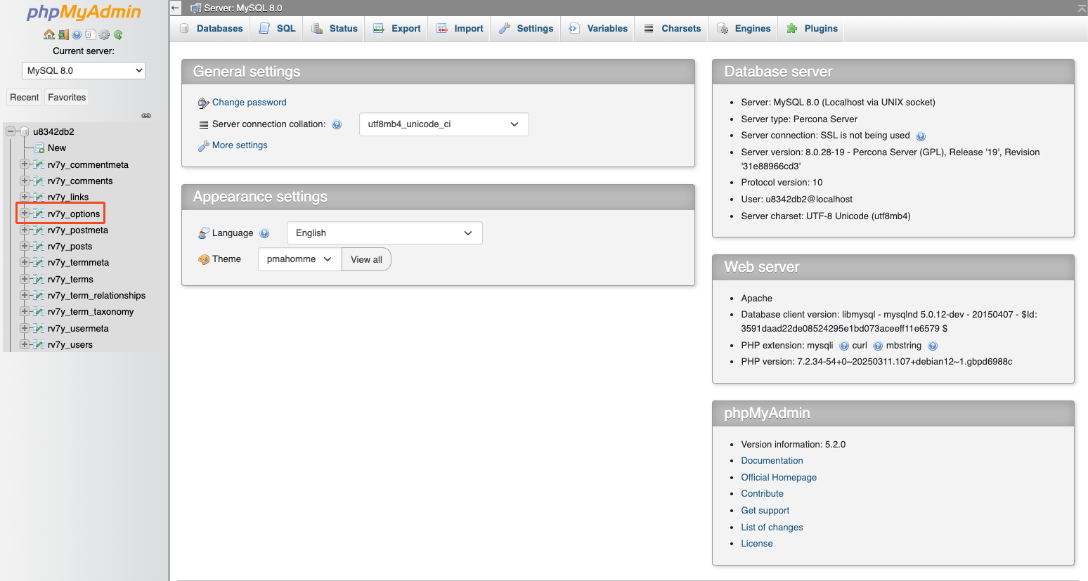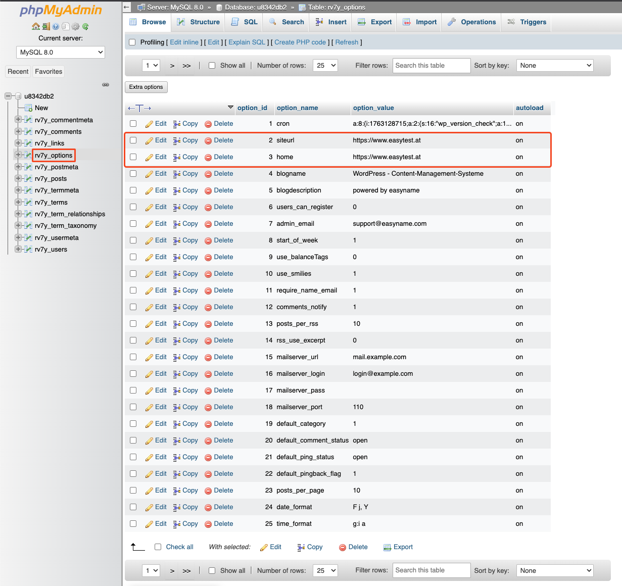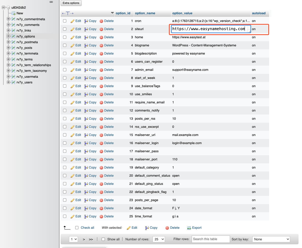 Klicken Sie auf wp_options (Im Beispiel ist das prefix rv7y_)