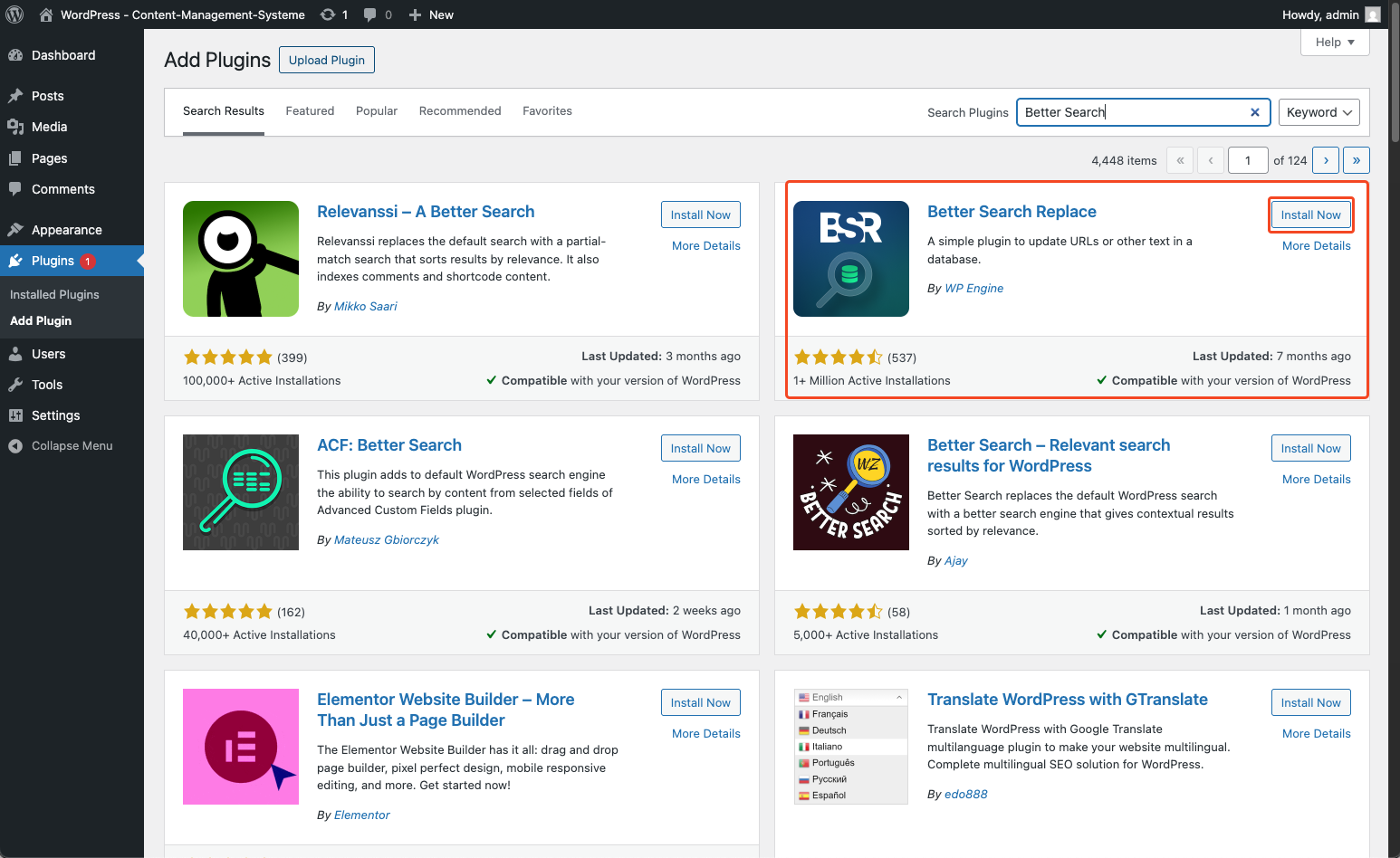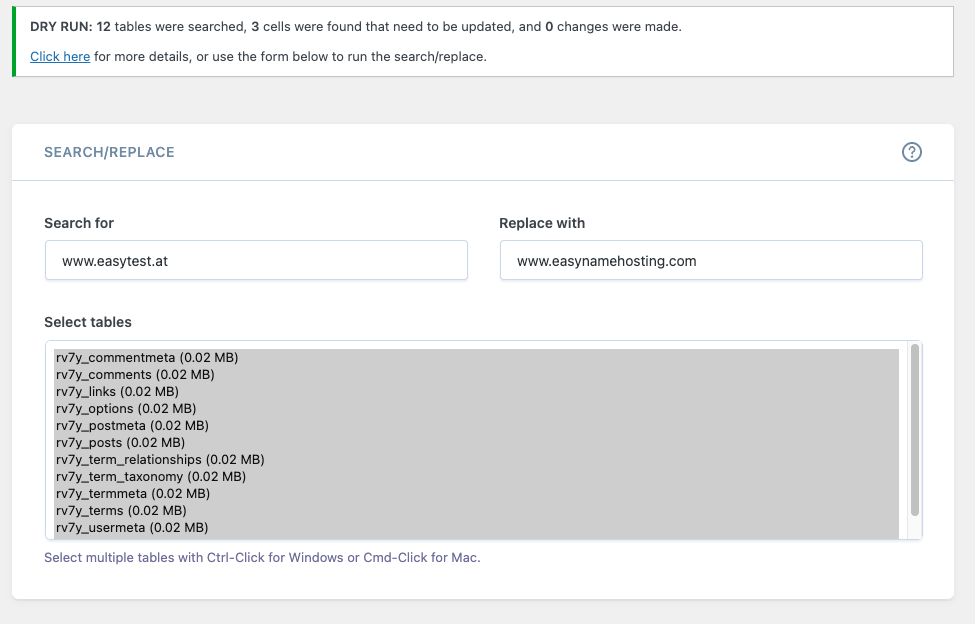 WordPress zeigt nun, wie viele Ersetzungen möglich sind