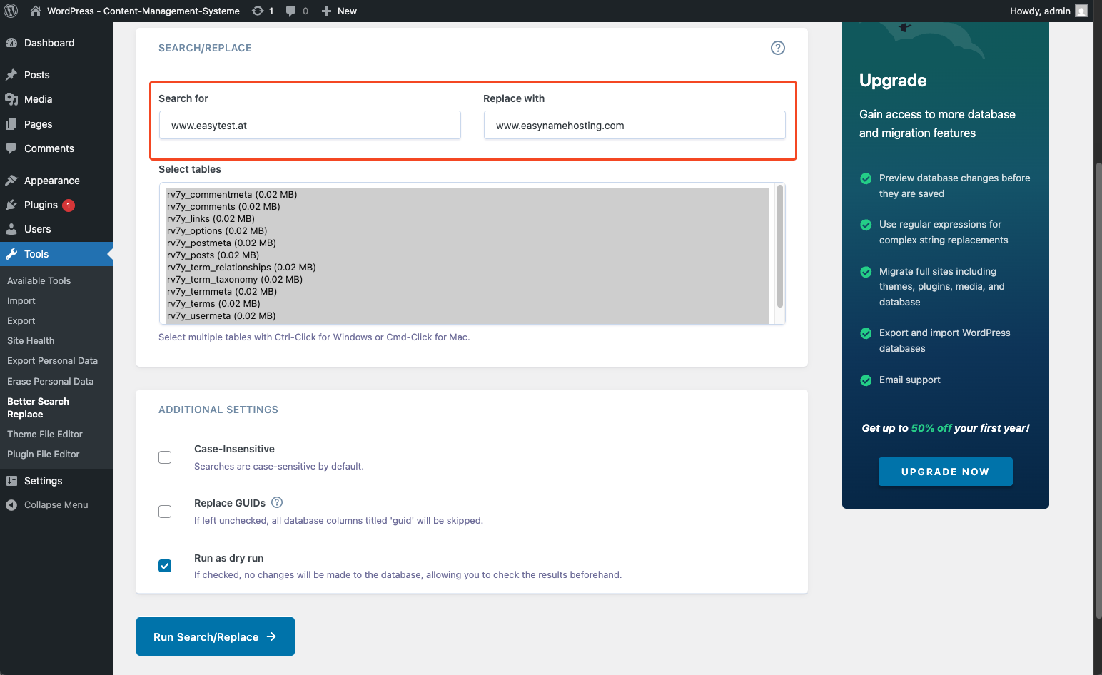 Jetzt starten erst die WordPress-Änderungsschritte (wp_options + Search & Replace).